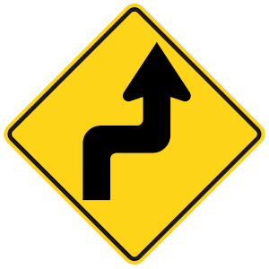 The road ahead turns sharply right then sharply left.