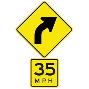 The road ahead curves right. Slow down to the safe speed indicated.